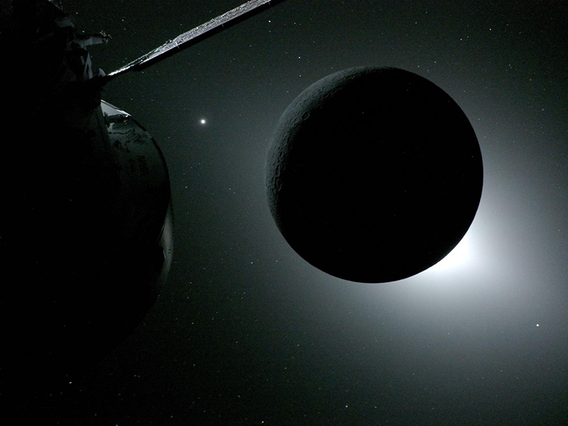 The Moon, backlit by the Sun during a solar eclipse, is photographed by NASA’s Orion spacecraft on April 6, 2026, during the Artemis II mission. [CREDIT: NASA]
