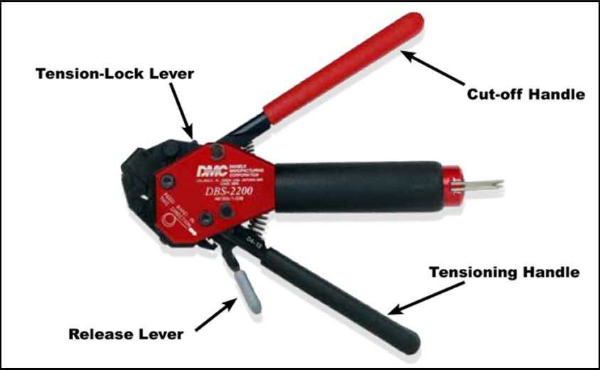 Release the tensioning handle and then squeeze the release lever. While squeezing the release lever, carefully pull on the band and slide it out of the tool and discard. |