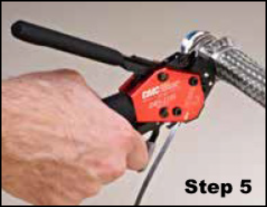 Once the tensioning handle is locked in place, squeeze the cut-off handle to finish the termination process. Both handles will open up on their own. (If shrinkable tubing is to be applied, it is recommended that the band is wrapped in tape and the excess braid folded back over the band to prevent cutting of shrinkable tubing). |