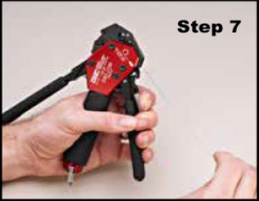 Repeatedly squeeze the tensioning handle until the band closes around the assembly. Once the band is closed around the assembly, use half strokes of the handle until the band is tight against the braided cable. Release the tensioning handle and allow it to open fully. With one final stroke, close the tensioning handle until it locks against the tool body. This indicates that the band has been tightened to the pre-set tension. |