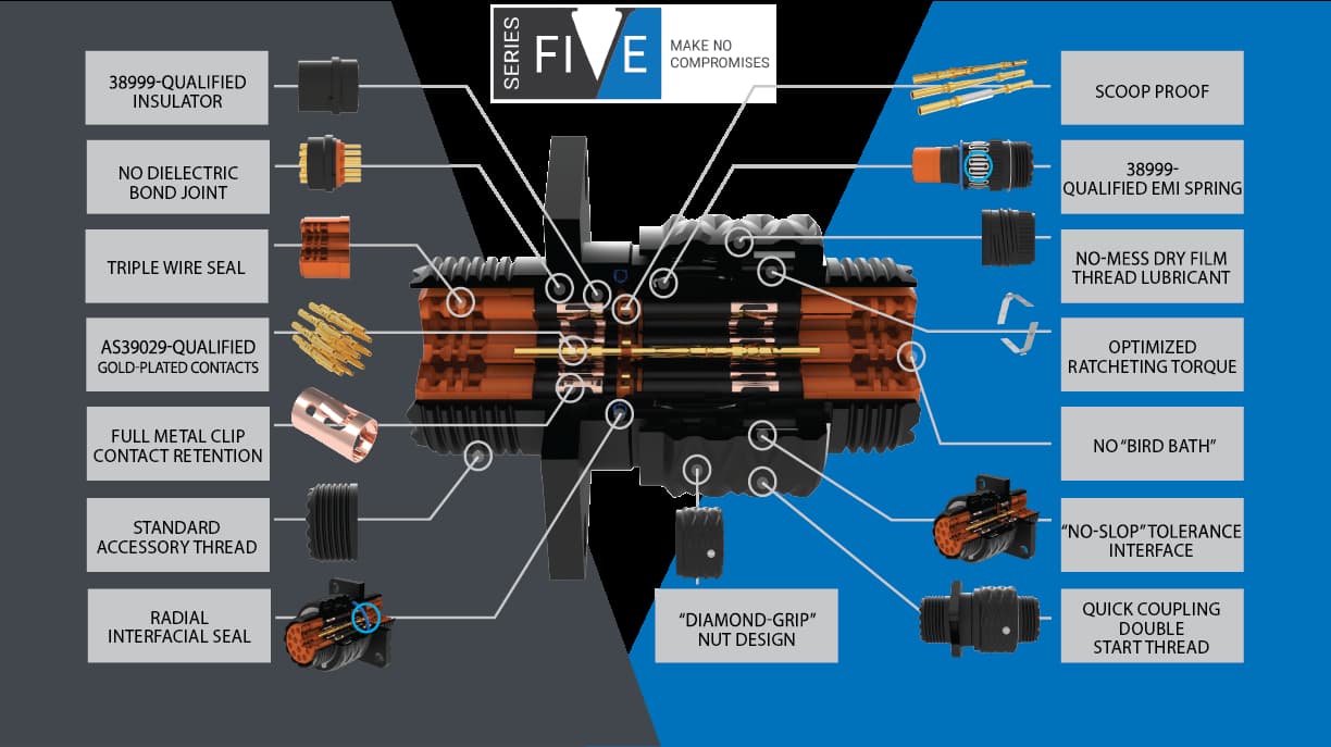 Series Five connectors are larger than 2M801 connectors but smaller than 2M805 connectors – size in this case is determined by the ratio of contact count to the largest coupling nut diameter. However, Series Five connectors meet every applicable electrical and environmental performance requirement of 38999 (unlike 2M, which is rated to lower temperature, vibration, and other requirements). A full comparison chart for performance will be made available on our web page soon, but in short Series Five is a denser circular connector than 2M that also performs better – a win/win!